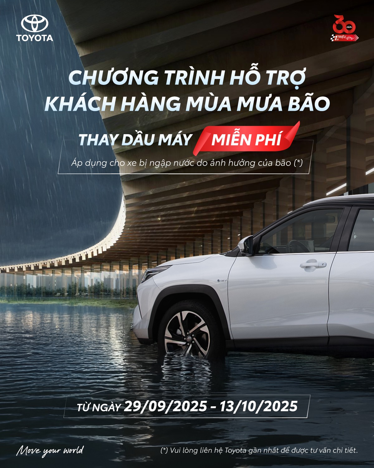 Để cùng Quý khách an tâm vượt qua mùa mưa bão, chương trình hỗ trợ đặc biệt từ Toyota Việt Nam vẫn đang được áp dụng đến hết ngày 13/10/2025: