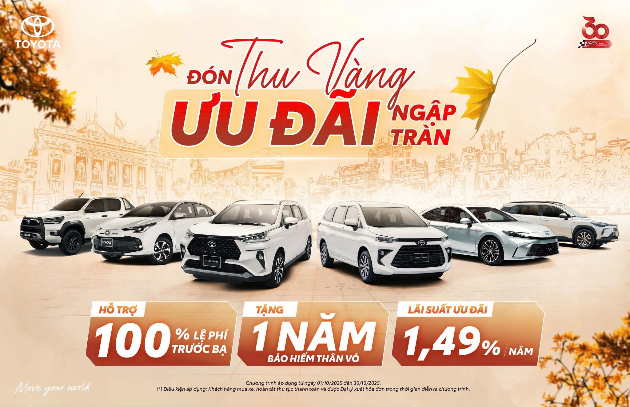 Chào tháng 10 rực rỡ với sắc thu nhuộm vàng khắp phố phường. Toyota Việt Nam gửi đến khách hàng loạt ưu đãi hấp dẫn dành cho những mẫu xe được yêu thích, để mỗi hành trình thêm trọn vẹn sắc màu và cảm hứng.