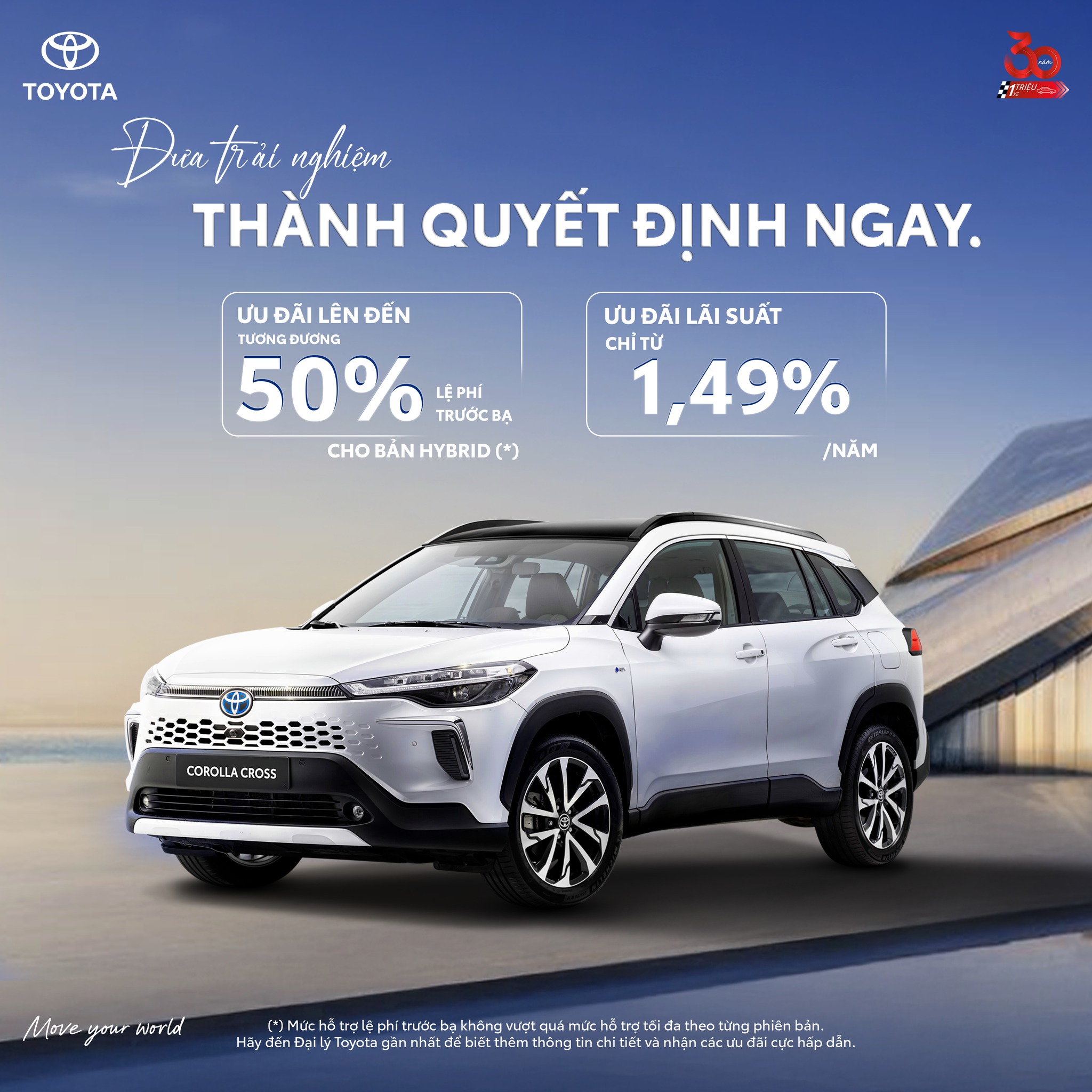 Chương trình áp dụng cho khách hàng mua xe Corolla Cross từ ngày 01/12 đến hết 31/12 tại hệ thống Đại lý Toyota trên toàn quốc.