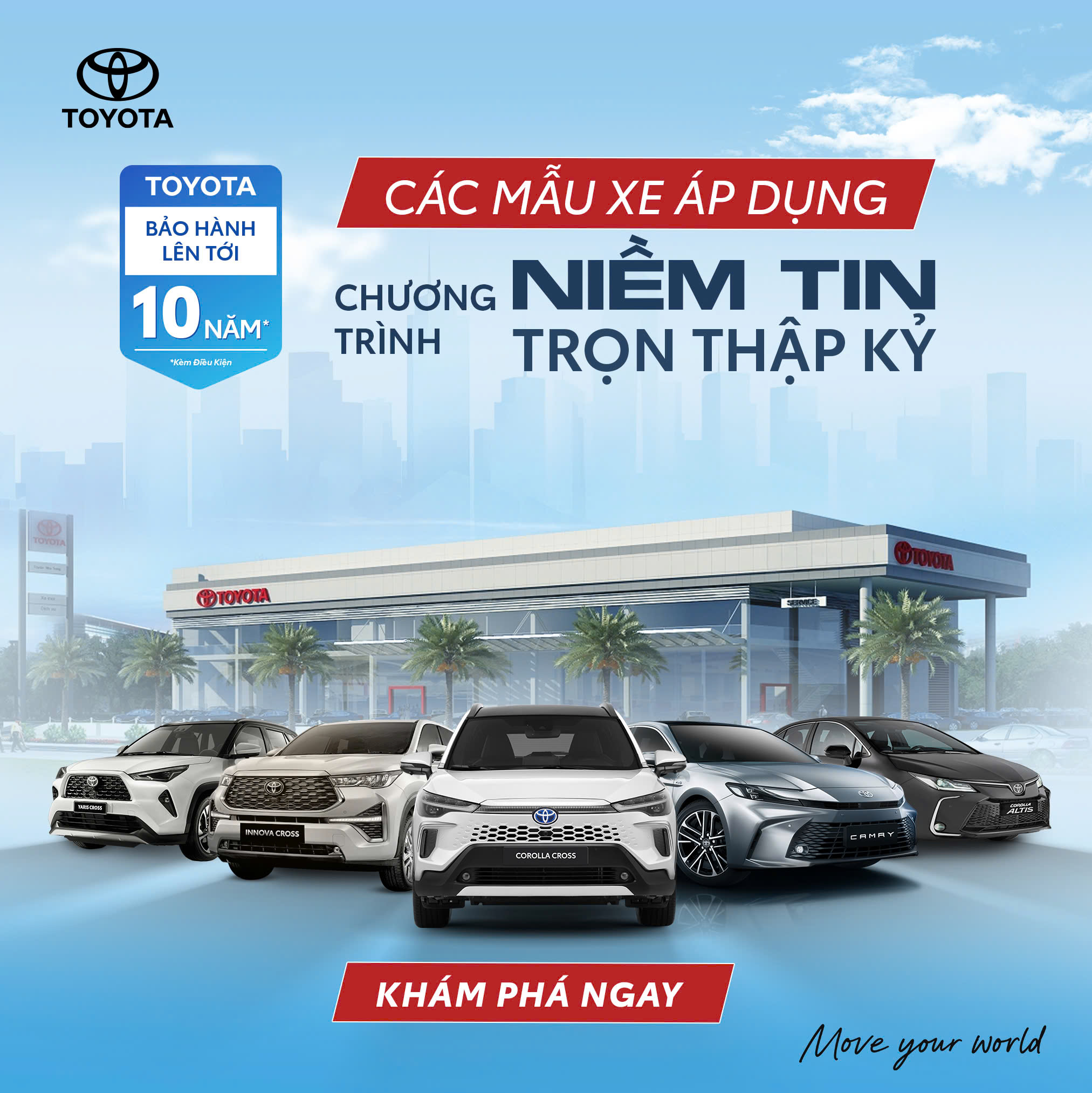 Toyota Việt Nam triển khai Chương trình Bảo hành chính hãng – “Niềm tin trọn thập kỷ”, áp dụng cho nhiều dòng xe Toyota, mang đến sự an tâm dài hạn trong suốt quá trình sử dụng.