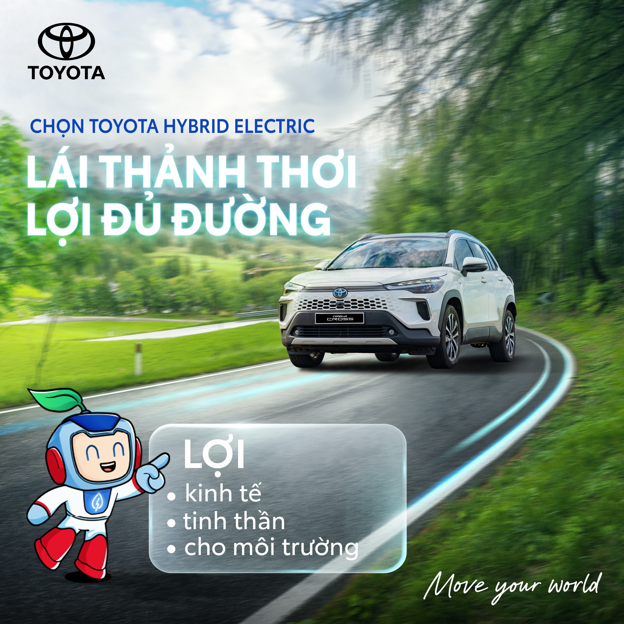 Chỉ với một lần đầu tư với Toyota Hybrid Electric, bạn đã sở hữu trọn bộ những trải nghiệm tiện lợi, vượt mong đợi: Lợi kinh tế – Lợi tinh thần – Lợi cho môi trường.